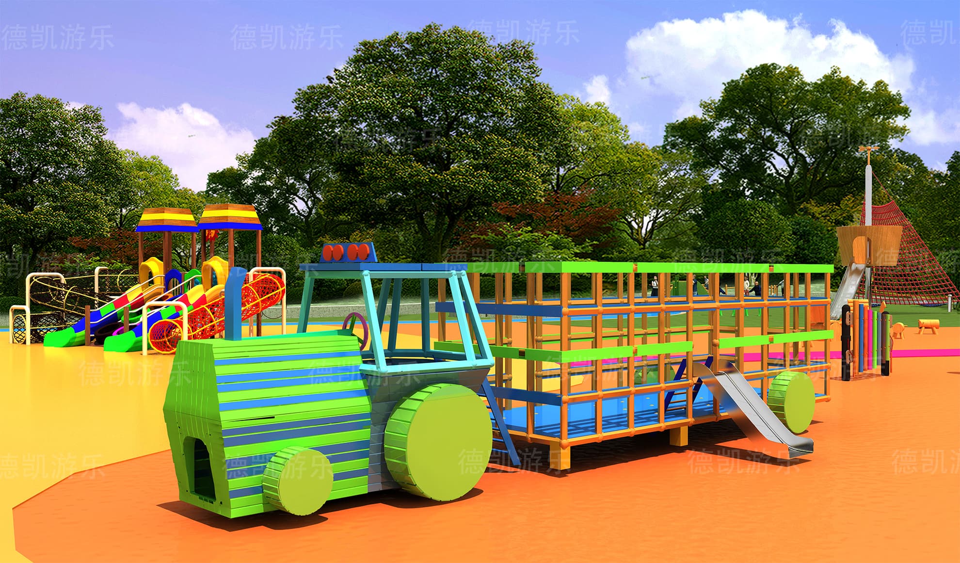 項目的主要規(guī)劃,場景的布置,設(shè)備的類型,設(shè)備的擺放以及整體場景的搭配,都在整體效果圖里面得到了體現(xiàn)。在效果圖之中,我們看見了沙池、攀巖組合和攀爬釘、攀爬桿、攀爬網(wǎng)、沙馳滑梯,還有沙池里面的挖沙機(jī)、小拓展、主體的滑梯、鉆網(wǎng),小火車滑梯組合、鉆網(wǎng)滑梯組合、拓展群組合、打擊樂器組合、旋轉(zhuǎn)秋千、蹦床、蹺蹺板、轉(zhuǎn)椅。
